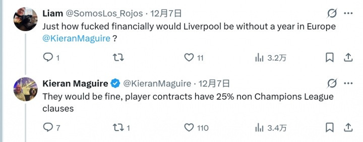 直播吧12月10日讯财务群众基兰·马奎尔在社媒上说念到利物浦的财务情况,默示球队即使无缘下赛季亚冠,财务现象也不会那么厄运。