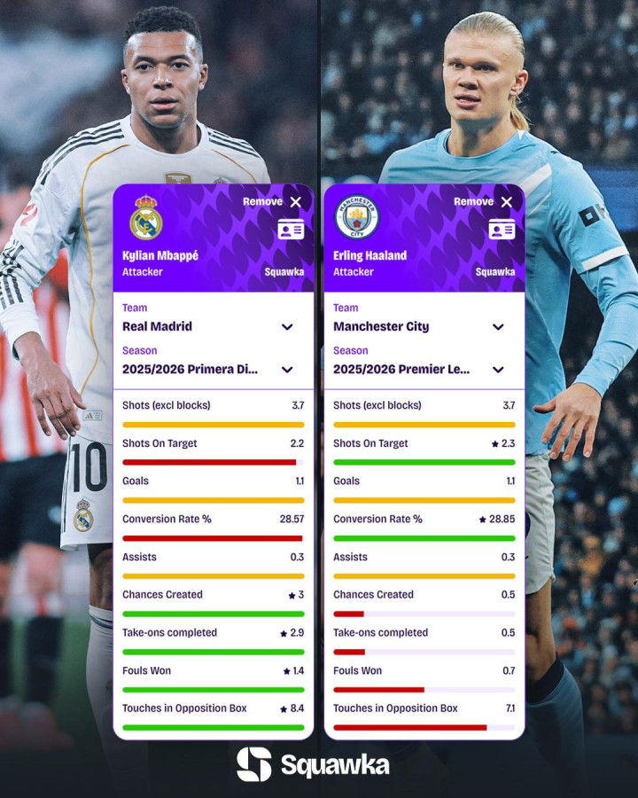 虎扑12月10日讯本轮欧冠,曼城将在客场对阵皇马。赛前Squawka数据统计,以下是姆巴佩与哈兰德在本赛季联赛每90分钟场均数据对比(姆巴佩在前):